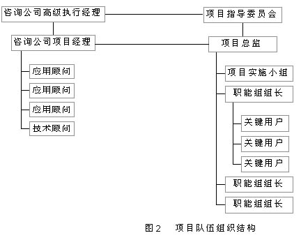 這支隊(duì)伍既有企業(yè)高級(jí)管理層所組成的指導(dǎo)委員會(huì)和咨詢公司人員,也有來(lái)自信息部門的技術(shù)人員和相應(yīng)職能部門的熟悉企業(yè)流程的業(yè)務(wù)人員所組成的實(shí)施小組和職能小組。項(xiàng)目隊(duì)伍組織結(jié)構(gòu)如圖2所示。