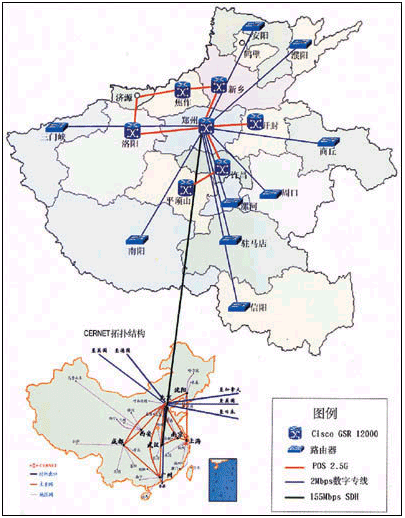 河南省教育科研計(jì)算機(jī)網(wǎng)(HERNET)作為中國教育科研計(jì)算機(jī)網(wǎng)絡(luò)(CERNET)在河南的省級(jí)網(wǎng)絡(luò),提供河南省的教育與科研機(jī)構(gòu)的Internet接入。在CERNET業(yè)已發(fā)展成為中國第二大互聯(lián)網(wǎng)的今天,各省教研網(wǎng)的建設(shè)變得尤為重要,河南省在2001年啟動(dòng)“教育信息化年”規(guī)劃后,多方合作,采用思科系統(tǒng)(中國)網(wǎng)絡(luò)技術(shù)有限公司的高端網(wǎng)絡(luò)設(shè)備,將原來骨干帶寬僅為2M的教育科研網(wǎng)升級(jí)到2.5G,順利實(shí)現(xiàn)了教育科研網(wǎng)絡(luò)應(yīng)用的飛躍性進(jìn)步,并且真正實(shí)現(xiàn)了“三網(wǎng)合一”。