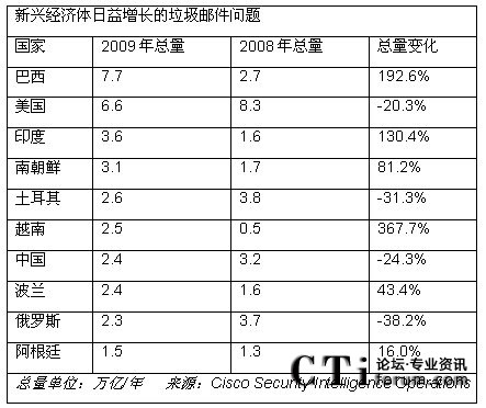 幾個(gè)世界經(jīng)濟(jì)領(lǐng)先的國(guó)家在2008年和2009年間垃圾郵件量有所降低;然而,發(fā)展中國(guó)家的垃圾郵件量呈現(xiàn)上升趨勢(shì)。