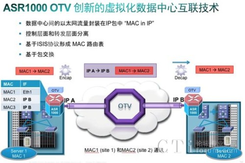Cisco OTV技術(shù)可以為跨任意傳輸網(wǎng)絡的二層連接擴展,提供運營優(yōu)化型解決方案。因此,OTV對于分布式數(shù)據(jù)中心的高效部署發(fā)揮著關(guān)鍵作用,有助于實現(xiàn)應用可靠性和靈活的工作負載遷移。OTV是一項“MAC in IP”技術(shù)。通過使用MAC地址路由規(guī)則,OTV可提供一種疊加(overlay)網(wǎng)絡,能夠在分散的二層域之間實現(xiàn)二層連接,同時保持這些域的獨立性以及IP互聯(lián)的容錯性、永續(xù)性和負載均衡優(yōu)勢。 圖1說明了這種工作機制。