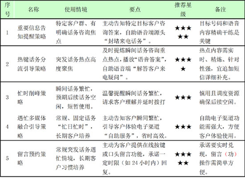 。1)策略內(nèi)容:在IVR主干語(yǔ)音提示客戶話務(wù)繁忙基礎(chǔ)上,增加“多媒體自助渠道引導(dǎo)”,并下發(fā)短信提示客戶如何使用。如:尊敬的客戶,目前人工話務(wù)繁忙,為節(jié)省您的時(shí)間,建議您登陸gd.10086.cn或wap.10086.cn或發(fā)送短信10086到10086,更多自助服務(wù)期待您精彩體驗(yàn)。