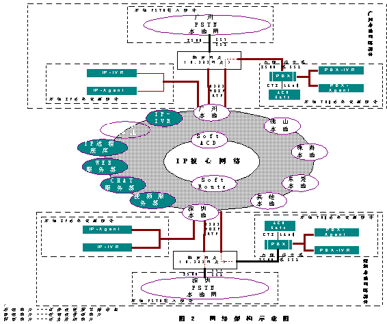 從網(wǎng)絡(luò)架構(gòu)示意圖2中可以看到,每一個(gè)PSTN本地網(wǎng)都是通過H323媒體網(wǎng)關(guān)連接到IP包交換網(wǎng)絡(luò),再接入到呼叫中心系統(tǒng)中來的,包括廣東省內(nèi)各個(gè)比較重要的城市(如深圳,珠海,中山,東莞等等)都可以設(shè)一個(gè)H323媒體網(wǎng)關(guān).同時(shí)所有的話務(wù)資源(如多媒體座席和IP-IVR系統(tǒng))都是直接通過IP網(wǎng)絡(luò)連接到呼叫中心系統(tǒng)中來的.