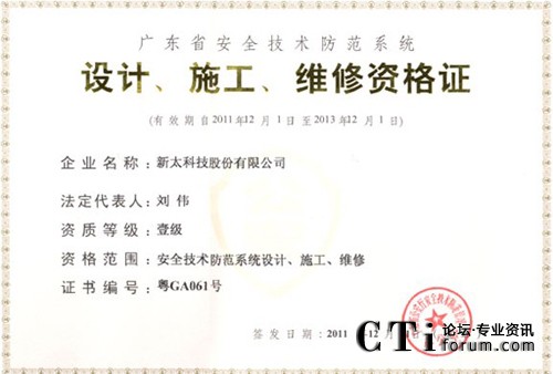 CTI論壇(ctiforum)1月31日消息(記者 浩宇):近日,新太科技股份有限公司再傳喜訊,公司順利通過廣東省公安廳認定的“廣東省安全技術(shù)防范系統(tǒng)設(shè)計、施工、維修一級資格證”換證審核,成功獲得新證書。此次新太科技資質(zhì)認證的通過,是新太科技公司全體員工通過兩年的不斷努力得到的豐碩成果,她不僅體現(xiàn)了新太科技安防技術(shù)等級在行業(yè)內(nèi)處于領(lǐng)先的優(yōu)勢,同時也體現(xiàn)出新太科技的管理和服務水平實現(xiàn)了行業(yè)內(nèi)的完美延續(xù)。
