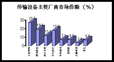 (1) 市場(chǎng)規(guī)模: 年內(nèi),寬帶網(wǎng)絡(luò)熱的興起極大地推動(dòng)了傳輸設(shè)備市場(chǎng)的發(fā)展,以DWDM為代表的高端光傳輸設(shè)備已進(jìn)入大規(guī)模商用階段,包括光分插復(fù)用設(shè)備(OADM)和光交叉連接設(shè)備(OXC)與現(xiàn)有傳統(tǒng)的SDH等傳輸設(shè)備市場(chǎng)空前繁榮,全年出貨值達(dá)到104.8億元人民幣。