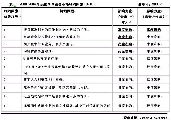 美國的WIN市場盡管處于強勢發(fā)展過程中,但這其中的變數(shù)也是有的。根據(jù)Frost & Sullivan 資料,2000-2004年間制約該市場發(fā)展的主要因素與影響力度見表二: