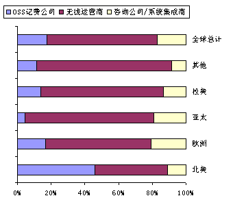 圖1、無線OSS計(jì)費(fèi)市場:2000年全球按照地區(qū)劃分的不同公司類型的整體市場收入估計(jì)(百萬美元)