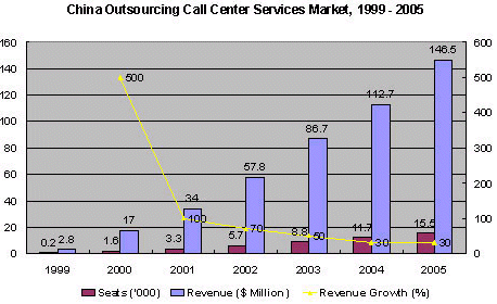 Frost & Sullivan公司研究表明在2000年,中國外包呼叫中心服務市場價值1700萬美元,共有1600坐席。本座席數是按照實際工作量來計算的,物理上存在的坐席數要超過2300個。因為許多坐席是在2000年下半年末才建成投入使用的,并且工作任務也沒有滿負荷。
