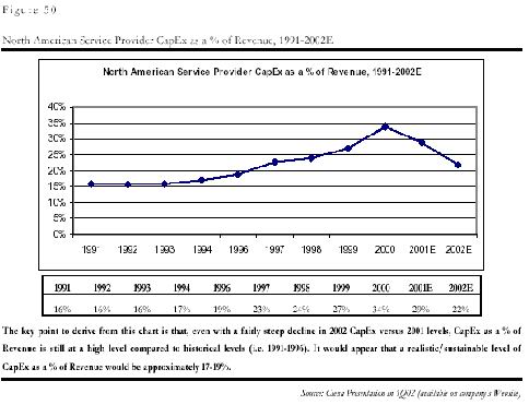 和中國的問題一樣,制造商的問題是電信服務(wù)企業(yè),即運(yùn)營商的投入減少造成的。由于上世紀(jì)末互聯(lián)網(wǎng)和電子商務(wù)泡沫的虛假繁榮的影響,各運(yùn)營商都嚴(yán)重高估了市場需求,認(rèn)為需求是會隨著通信能力的增強(qiáng)無限增加,因此市場規(guī)模是會無限擴(kuò)張的,他們在缺乏對最終用戶需求的深入分析的前提下,普遍在基礎(chǔ)設(shè)施的建設(shè)上進(jìn)行了超大規(guī)模的投入,其基礎(chǔ)設(shè)施建設(shè)投入在收入中的比例一度在2000年從平均的15%達(dá)到了創(chuàng)記錄的35%!