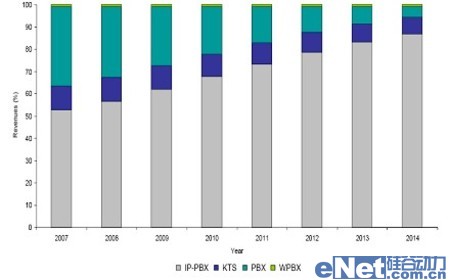 隨著中國(guó)經(jīng)濟(jì)的高速發(fā)展,企業(yè)通信市場(chǎng)也將保持一定的發(fā)展速度。Frost & Sullivan數(shù)據(jù)顯示,從2007年到2014年,國(guó)內(nèi)企業(yè)通信市場(chǎng)年均復(fù)合增長(zhǎng)率為5.9%,到2014年市場(chǎng)規(guī)模約為4.82億美元。其中,企業(yè)IP通信市場(chǎng)將保持高速發(fā)展態(tài)勢(shì),年均復(fù)合增長(zhǎng)率將達(dá)到13.7%,市場(chǎng)規(guī)模將從2007年的1.71億美元增長(zhǎng)到2014年的4.19億美元。屆時(shí),IP通信將擁有整個(gè)企業(yè)通信市場(chǎng)86.9%的市場(chǎng)份額。傳統(tǒng)的PBX及KTS市場(chǎng)將持續(xù)萎縮。