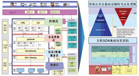 在具體實現(xiàn)的技術路線上,產(chǎn)品采用以J2EE為核心的層次化體系結構,基于業(yè)務流程管理和業(yè)務規(guī)則管理引擎,實現(xiàn)界面表現(xiàn)層與業(yè)務邏輯層、業(yè)務邏輯層與應用組件層、應用組件層與數(shù)據(jù)訪問層、數(shù)據(jù)訪問層與數(shù)據(jù)存儲層之間的分離,支持統(tǒng)一的權限管理和認證機制以及統(tǒng)一的企業(yè)門戶接入。(如圖1所示)