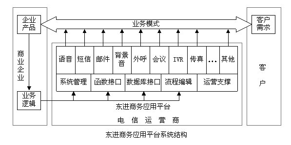 東進商務應用平臺能同時滿足電信運營商和商業(yè)企業(yè)的業(yè)務需求。平臺融合了電信網、互聯(lián)網和內部辦公網,整合了電信運營商和商業(yè)客戶的業(yè)務需求,利用國內所有基礎運營商(包括中國網通、中國電信、中國移動、中國聯(lián)通、中國鐵通)的通信終端,通過電話語音、短信和傳真等方式與客戶或服務對象進行溝通。商業(yè)企業(yè)能根據自身的工作流程和業(yè)務邏輯,充分利用自身的客戶數據庫和員工數據庫,進行低成本、高效率的服務溝通,實現企業(yè)服務、營銷和管理等方面高效運轉,提升核心競爭力和服務滿意度。同時,電信運營商業(yè)增加了話務量,實現了增量亦增收、提升了arpu值。