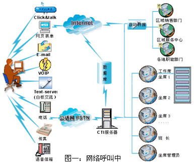 星際(杭州)網(wǎng)絡(luò)技術(shù)有限公司(www.ebanswers.com)在調(diào)查中發(fā)現(xiàn),隨著信息技術(shù)的發(fā)展,消費者在客戶服務(wù)上提出了更高的要求。在接入渠道上,他們希望既可以通過電話、傳真接入,也可以通過網(wǎng)絡(luò)接入;在方式上,既可以通過語音接入,又可以通過各類文字交流。星際網(wǎng)絡(luò)推出的網(wǎng)絡(luò)呼叫中心正是這樣一種呼叫中心的延伸與完善,如圖一所示。與傳統(tǒng)呼叫中心相比,網(wǎng)絡(luò)呼叫中心具有三大特點:首先,網(wǎng)絡(luò)呼叫中心整合了現(xiàn)有的所有客戶接入渠道,包括電話、傳真、網(wǎng)上文字交流、Email、Web call等,為客戶提供最寬暢的接入通道;其次,對于一個企業(yè)而言,它是企業(yè)各分呼叫中心的整合;最后,在服務(wù)流程的規(guī)范上,通過知識庫等輔助功能又可以統(tǒng)一服務(wù)口徑,提升企業(yè)形象。