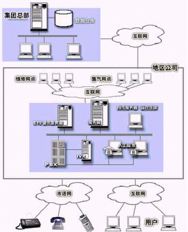 各地區(qū)系統(tǒng)通過互聯(lián)網(wǎng)和下屬維修網(wǎng)點、銷售網(wǎng)點相連,構(gòu)成一個地區(qū)性服務(wù)網(wǎng)絡(luò)。各地區(qū)系統(tǒng)通過互聯(lián)網(wǎng)和集團(tuán)總部連接,構(gòu)成信息收集網(wǎng)絡(luò)。前者支持業(yè)務(wù)服務(wù),后者支持管理決策,共同構(gòu)成綜合公用事業(yè)服務(wù)平臺。