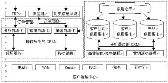 正如圖1所示,現(xiàn)在一般認(rèn)為,目前的CRM產(chǎn)品分為這樣基本的三類:分析型CRM(圖中的分析層次的CRM)、運(yùn)營(yíng)型CRM(圖中的操作層次的CRM)和交互型CRM(圖中的客戶接觸中心)。交互型CRM主要在于建立一個(gè)企業(yè)與用戶的交互、溝通渠道,如電話、傳真、Web、Email、短消息、面對(duì)面接觸;運(yùn)營(yíng)型CRM主要在于運(yùn)行企業(yè)的市場(chǎng)營(yíng)銷、銷售和服務(wù)的自動(dòng)化應(yīng)用,記錄客戶的基本信息和互動(dòng)信息;而分析型CRM則在于分析完整客戶信息(包括靜態(tài)的客戶基本信息和動(dòng)態(tài)的客戶交互信息),掌握和預(yù)測(cè)客戶的個(gè)性化需求,并開展相應(yīng)的營(yíng)銷和銷售活動(dòng),提供相應(yīng)的服務(wù)和支持。