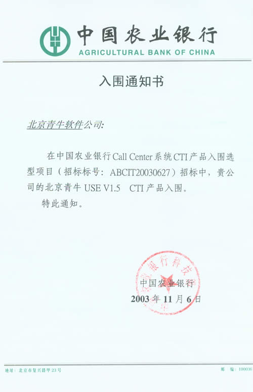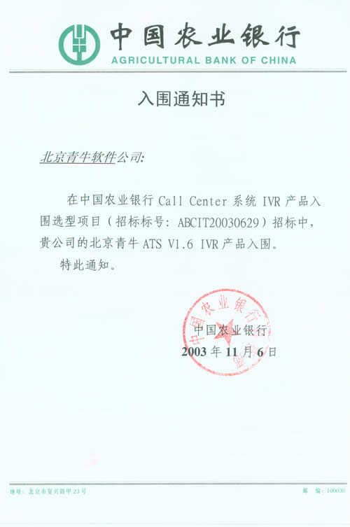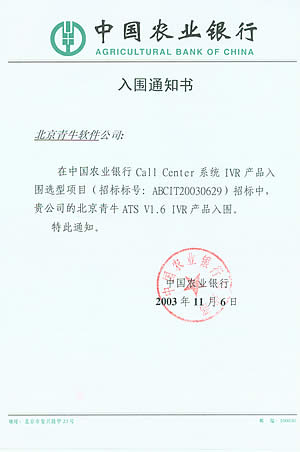 中國農(nóng)業(yè)銀行是四大國有獨資商業(yè)銀行之一,被《財富》評為世界500強企業(yè)之一。目前農(nóng)行已在全國范圍內(nèi)開通95599特服電話短號碼,為進一步整合現(xiàn)有電話銀行和客服中心資源,提高客戶滿意度和忠誠度,并通過客服中心的渠道,加快農(nóng)行金融產(chǎn)品的推廣,中國農(nóng)業(yè)銀行將在全國36個省域分行的基礎(chǔ)上加快建設(shè)成總行集中管理、標準服務(wù)集中、特色服務(wù)分散,統(tǒng)一客戶服務(wù)界面的全國客戶服務(wù)中心系統(tǒng)。為此,中國農(nóng)業(yè)銀行科技部就Call Center系統(tǒng)的關(guān)鍵性產(chǎn)品,CTI、PBX、 IVR產(chǎn)品向國內(nèi)外著名廠商進行入圍招標活動,參與廠商匯集國內(nèi)外各大知名企業(yè),是一次國際水平的重量級選型過程。通過嚴格的技術(shù)測試和綜合考評,中國農(nóng)業(yè)銀行確認了Call Center系統(tǒng)的入圍產(chǎn)品廠商名單,青牛軟件的CTI產(chǎn)品-青牛USE,IVR產(chǎn)品-青牛ATS在多項測評中名列前茅。