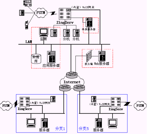 目前清華誠志數(shù)碼公司分支機(jī)構(gòu)有5個(gè),可以通過ZingServ交換機(jī)的內(nèi)置VoIP功能在5個(gè)分支機(jī)構(gòu)實(shí)現(xiàn)組網(wǎng),從而大大節(jié)省長話費(fèi)用,并實(shí)現(xiàn)內(nèi)部分機(jī)號(hào)統(tǒng)一編碼: