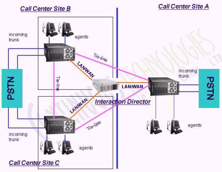 CIC系統的分布式多點支持模塊可以將多臺聯網的CIC服務器分布在多個地方,采用智能路由和呼叫溢出技術支持負載均衡、災難備份和大容量系統。CIC系統的分布式多點支持模塊有兩類,支持小規(guī)模分布(4個分布點以下)的稱為Interaction Multi-Site ,支持較大規(guī)模分布的稱為Interaction Director。