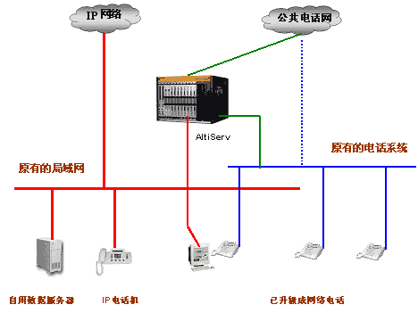 員工的電話有兩種選擇,一是傳統(tǒng)的模擬電話,以傳統(tǒng)的交換機(jī)布線方式,接普通的模擬電話線(雖然外表一樣,但它其實已經(jīng)是從Altiserv接出的網(wǎng)絡(luò)電話)。二是采用IP數(shù)字電話,以網(wǎng)線方式插入局域網(wǎng)的端口或集線器。在辦公室內(nèi)使用IP數(shù)字電話和普通模擬電話沒有多大的區(qū)別;兩種電話還可以在一個Altiserv下同時使用。
