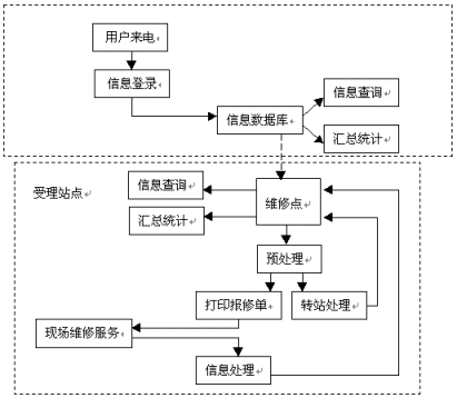 維修點(diǎn)對用戶的報(bào)修情況進(jìn)行預(yù)處理之后,根據(jù)用戶所在的區(qū)域,分配至最近距離的維修站,將用戶與其報(bào)修信息即時(shí)轉(zhuǎn)移,這也就是圖中所顯示的"轉(zhuǎn)站處理"。之后,維修站將直接打印出報(bào)修單,加快服務(wù)實(shí)施的效率、減少人工出錯(cuò)的比例,有專業(yè)人員及時(shí)上門服務(wù)檢修。