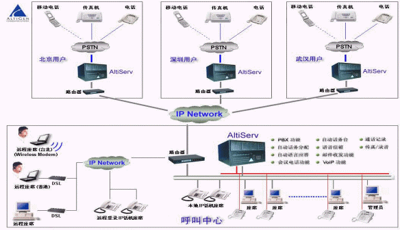 AltiCenter 將奧迪堅(jiān)所倡導(dǎo)的基于IP分布式呼叫中心技術(shù)完美轉(zhuǎn)化為產(chǎn)品,為用戶(hù)輕松構(gòu)建基于IP的分布式呼叫中心系統(tǒng)。該呼叫中心不僅提供語(yǔ)音電話,還能提供包括音頻視頻在內(nèi)的多媒體通信;不僅能支持傳統(tǒng)的電話終端,還能支持來(lái)自Internet的語(yǔ)音、數(shù)據(jù)信息等多種交互方式;不僅提供了完整的本地座席功能,還提供遠(yuǎn)程IP座席,遠(yuǎn)程IP專(zhuān)家座席,并提供高度統(tǒng)一實(shí)用的呼叫中心管理體系。AltiCenter在設(shè)計(jì)之初就采用IP內(nèi)核的一體化設(shè)計(jì),不需要任何語(yǔ)音網(wǎng)關(guān)設(shè)備,就可以在網(wǎng)絡(luò)上構(gòu)建一個(gè)語(yǔ)音和數(shù)據(jù)的統(tǒng)一平臺(tái),無(wú)論在世界的哪個(gè)角落,遠(yuǎn)程IP座席和分布的異地機(jī)構(gòu)都可以共享客戶(hù)的所有資源(語(yǔ)音、數(shù)據(jù)、座席),由于采用了先進(jìn)的VoIP技術(shù),可以為各地的電話和Internet的客戶(hù)提供統(tǒng)一的客戶(hù)號(hào)碼和統(tǒng)一的客戶(hù)服務(wù),并極大地降低呼叫中心的運(yùn)營(yíng)成本,真正幫助用戶(hù)建立一個(gè)高效的、信息共享的分布式呼叫中心系統(tǒng)。