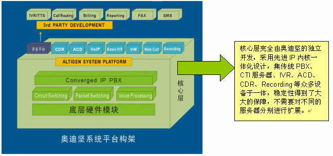值得一提的是,在穩(wěn)定性上,奧迪堅IP一體化呼叫中心平臺系統(tǒng)構(gòu)架,從產(chǎn)品設(shè)計之初就突破了以住基于交換機(jī)或板卡的傳統(tǒng)模式,在一臺通訊服務(wù)器上高度融合了呼叫中心的所有常用功能,有效避免了復(fù)雜的網(wǎng)絡(luò)連接和眾多的各類交換機(jī)和外掛設(shè)備,各個設(shè)備相對獨立兼容性差所給呼叫中心系統(tǒng)所帶的穩(wěn)定性欠佳的隱患。除此之外,奧迪堅呼叫中心系統(tǒng)底層硬件模塊是在美國設(shè)計生產(chǎn)的,通過北美和中國的嚴(yán)格的電信入網(wǎng)測試;相對于硬件,平臺軟件也都是由奧迪堅自主開發(fā)設(shè)計的,針對不同的硬件采用不同的驅(qū)動模塊,軟硬一體在交換層又使用統(tǒng)一的邏輯接口,結(jié)構(gòu)清晰,層次合理,不僅保障了穩(wěn)定而且便于擴(kuò)展(如下圖所示),整個系統(tǒng)作為一個整體統(tǒng)一擴(kuò)展,不需要對不同的服務(wù)器分別進(jìn)行擴(kuò)展,有效避免了傳統(tǒng)呼叫中心構(gòu)建方式在擴(kuò)展方面存在的復(fù)雜性問題以及高額的擴(kuò)展費用。