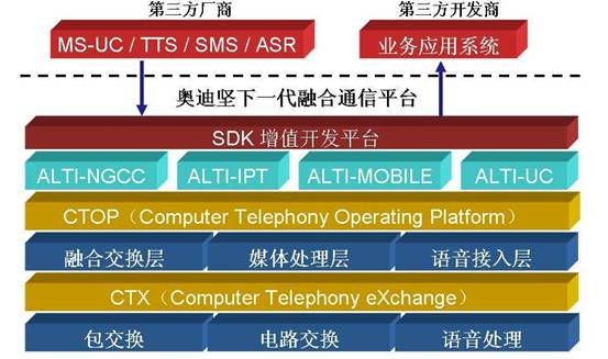 下一代融合通信平臺架構(gòu)CTOP(Computer Telephony Operation Platform)包含了融合交換層、媒體處理層和語音接入層,與傳統(tǒng)通信平臺架構(gòu)的區(qū)別之處在于:其融合交換層不僅僅包含IP-PBX功能,還包含ACD、CTI、IVR、CDR、Voice