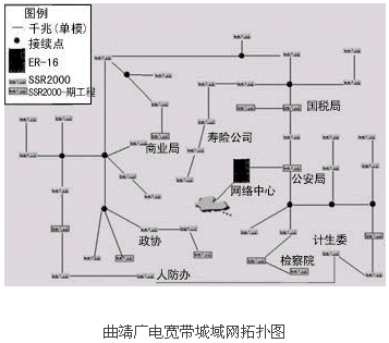 網(wǎng)絡(luò)建設(shè)的第一期工程結(jié)束后,本地多媒體寬帶骨干網(wǎng)以曲靖市政府內(nèi)的機(jī)房作為中心機(jī)房。核心機(jī)房采用支持千兆以太網(wǎng)、SDH及ATM接口的高檔交換式路由器ER-16。主干光纖沿市區(qū)鋪設(shè)成為一個星形鏈路,以便在不久的將來能夠?qū)⒂嬌腿朔擂k的光纖連接起來形成一個環(huán)狀鏈路。市區(qū)內(nèi)共設(shè)43個光節(jié)點(diǎn),各鄉(xiāng)鎮(zhèn)有一個光節(jié)點(diǎn),以92條單模光纖直接連入核心機(jī)房的交換式路由器,由此與核心機(jī)房形成一個星狀拓?fù)浣Y(jié)構(gòu)。