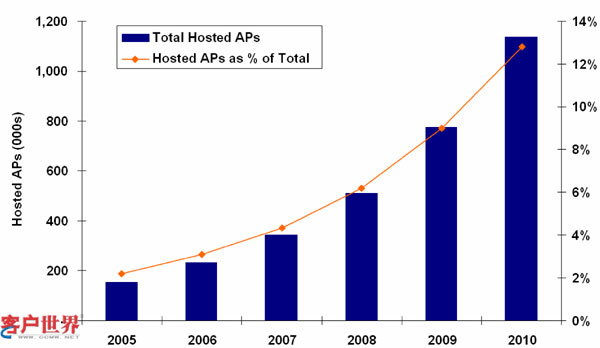 根據(jù)datamonitor在2006年的分析,自2005年起,全球呼叫中心托管的總數(shù)約二十萬(wàn)個(gè)座席,占全球呼叫中心的總座席數(shù)得2%,到2008年成長(zhǎng)到約五十萬(wàn)個(gè)座席,占總量的6%左右,在2010年時(shí)更會(huì)成長(zhǎng)到超過一百萬(wàn)個(gè)座席占總數(shù)的10%左右。所以整個(gè)托管市場(chǎng)來說將會(huì)持續(xù)不斷的成長(zhǎng)(見圖二)。
