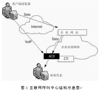 互聯(lián)網(wǎng)呼叫中心是在互聯(lián)網(wǎng)技術(shù)飛速發(fā)展的基礎(chǔ)上所產(chǎn)生的。對于客戶而言,完全的互聯(lián)網(wǎng)呼叫中心和傳統(tǒng)呼叫中心最大的區(qū)別就在于客戶無需電話,只要從一個(gè)Web站點(diǎn)就可以直接進(jìn)入互聯(lián)網(wǎng)呼叫中心。這樣一來,呼叫中心就從傳統(tǒng)形式上的“撥號(hào)-交談(Dial to Talk)”發(fā)展到現(xiàn)代形式的“點(diǎn)擊-交談(Click to Talk)”。典型的互聯(lián)網(wǎng)呼叫中心結(jié)構(gòu)如圖1所示。