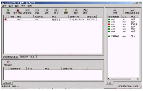 3) 分機(jī)用戶軟件:安裝在客戶的計(jì)算機(jī)中,是可以在屏幕上進(jìn)行多種語(yǔ)音、數(shù)據(jù)處理的綜合信息中心,它將語(yǔ)音郵件和普通電子郵件完美結(jié)合;其界面操作功能親近直觀。