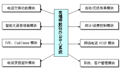 模塊包括:一號(hào)通功能、語(yǔ)音留言、留言通知功能、客戶通過(guò)密碼遠(yuǎn)程登錄控制功能、與電子郵件集成的語(yǔ)音郵件(Voice Mail)系統(tǒng)、群組廣播功能等功能。