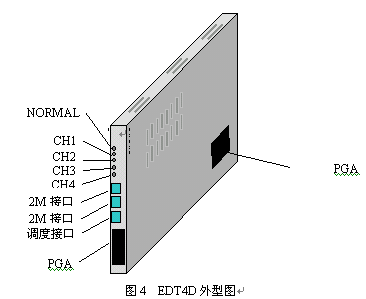 EDT4D是在舊EDT4板上增加調(diào)度接口。見圖4,EDT4D為一塊H20-20交換機(jī)插板,厚度為兩個(gè)槽口。EDT4通過(guò)扁平電纜與交換機(jī)公共控制機(jī)柜的背板PGA相連,提取交換機(jī)時(shí)隙;并將時(shí)隙轉(zhuǎn)換為由四個(gè)數(shù)字中繼接口E1組成的準(zhǔn)V5.2接口與遠(yuǎn)端模塊相連。一塊EDT4可接2個(gè)PGA端口組,共128個(gè)話路。