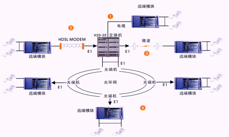 1) 遠(yuǎn)端模塊通過(guò)SDH或PDH光端機(jī)與交換機(jī)連接:這是用得最多的方式。光纖具有良好的穩(wěn)定性和傳輸特性,使得系統(tǒng)最穩(wěn)定。