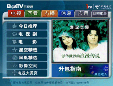 上海IPTV業(yè)務自2006年9月1日放號以來,發(fā)展十分迅速。截止10月7日,上海電信IPTV業(yè)務共計發(fā)展用戶達2.2萬。如下是上海IPTV商用系統(tǒng)EPG頁面: