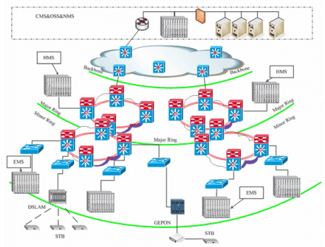 奔流(RollingStream)系統(tǒng)可以支持百萬級別的用戶規(guī)模,支持3級和多級部署架構(gòu)。包括中心節(jié)點(CMS)、區(qū)域匯聚節(jié)點(HMS)以及邊緣服務節(jié)點(EMS)。奔流(RollingStream)系統(tǒng)對于寬帶IP網(wǎng)絡的容忍度是很高的,可以支持各種網(wǎng)絡承載形式,也可支持各種接入方式。如LAN接入、DSLAM接入、GEPON接入。對于IPTV系統(tǒng),可建設專網(wǎng),CMS和HMS、EMS直接相連,也可以旁掛在城域網(wǎng)上。另外,無論PPPoE還是DHCP上網(wǎng)方式都可以支持。