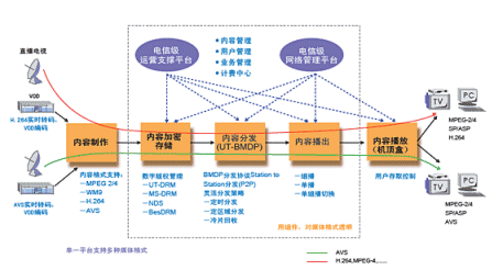 奔流(RollingStream)系統(tǒng)為IPTV業(yè)務提供了端到端的業(yè)務解決方案,先進的系統(tǒng)架構(gòu)對Codec完全透明,可透明支持AVS,如下圖。奔流(RollingStream)系統(tǒng)包括內(nèi)容制作、內(nèi)容存儲/加密、內(nèi)容分發(fā)、內(nèi)容播放、終端顯示的各個方面,都可提供基于電信級的解決方案。