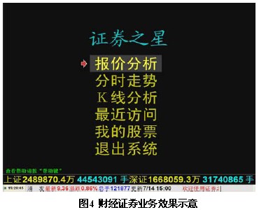 斯達(dá)康奔流系統(tǒng)的“證券之星”業(yè)務(wù)基于電視界面提供用戶一種易接受的信息讀取方式,可以有效地滿足這部分人群的需要。用戶通過遙控器和電視,可實(shí)現(xiàn)股票大盤行情顯示、個(gè)股實(shí)時(shí)行情分析、各種走線趨勢(shì)圖的瀏覽等功能。