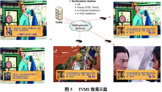 TVMS可以支持用戶間通過電視屏幕顯示手機(jī)短信息;支持向全頻道發(fā)送信息,如政府公告、天氣預(yù)警、水電費(fèi)用催繳等等;也可以向特定人群發(fā)送廣告信息;廣電運(yùn)營商可通過該功能開展互動(dòng)娛樂業(yè)務(wù)。