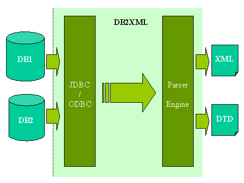 DB2XML中通過(guò)JDBC或JDBC-ODBC橋接各種現(xiàn)存的數(shù)據(jù)庫(kù),訪問(wèn)數(shù)據(jù)庫(kù)中的表;通過(guò)XML parser構(gòu)造出代表數(shù)據(jù)庫(kù)內(nèi)容的XML文件。DTD文件描述了從數(shù)據(jù)庫(kù)中的表到XML文件的對(duì)應(yīng)關(guān)系。上圖描述了DB2XML的輸入輸出關(guān)系。事實(shí)上DB2XML是按照以下步驟完成轉(zhuǎn)化工作的: