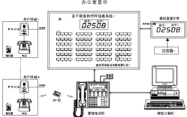 辦公室顯示大屏、管理電話機、值班室顯示屏、應答器、系統(tǒng)管理軟件(安裝在微型計算機)