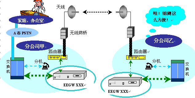 現(xiàn)今的計算機網絡建設中,多以DDN為主的局域網互連,往往由于DDN線路不能到達或要求專用內部通道等原因,建設以無線為室外主要網絡通道的數(shù)據通信平臺,配合IP語音網關形成內部的語音通信系統(tǒng),不僅建設簡單(無須各種市政管理部門的批復),并且造價較低,快速有效地解決數(shù)據互連及建立專用安全保密的內部語音系統(tǒng)。