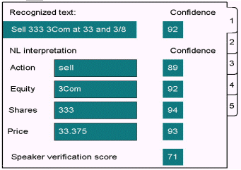 也可使用外部的應(yīng)用知識內(nèi)容來確定多結(jié)果中的哪一個是有效的。例如,經(jīng)紀(jì)業(yè)務(wù)應(yīng)用程序,它的用戶投資隨時間變化而變化。系統(tǒng)可使用簡單的語法來識別股票證券的名稱。識別時,系統(tǒng)產(chǎn)生一個最佳前N個股票名稱的清單,標(biāo)明假設(shè)的股票證券名稱。應(yīng)用程序然后將每個清單項目(由最佳到最差)和現(xiàn)有股票證券名稱進行比較,從而為該用戶找到可能性最大的一個。下圖展示的是這些多結(jié)果情況,每個結(jié)果都可能有它自身的已被識別的文本、NL解釋和置信度分值。在這一例中,請求了五個識別結(jié)果。