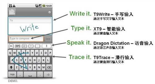 楊先生:Nuance T9 Trace解決了觸屏手機輸入文字的用戶體驗,適應(yīng)各種使用環(huán)境。另外,T9 Trace作為 XT9的插件,借助XT9的強大引擎提供周邊鍵盤自動的糾錯功能,它可以會根據(jù)按鍵組合智能猜測您所需要輸入的文字。我們可以看到國內(nèi)好多手機的屏幕都非常小,2000元級別的手機屏幕大概是2.8英寸甚至2.5英寸,如果你要點命中的機會率更低了。所以滑行上來講可以某程度上解決這方面的問題。所以我們覺得這個滑行輸入法很有潛能的,特別是在中低端的Android平臺機型上。