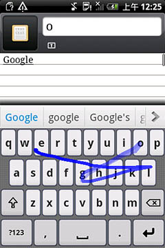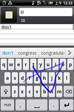 如圖所示,Nuance T9 Trace英文輸入方案對于各種不同的字母組合都能有效識別,像“google”這種既有連續(xù)又有間斷重復(fù)字母的單詞也不在話下,一次就能精準輸出。另外,該輸入法還可以省去標點符號,如“don"t”“can"t”等單詞,用戶只需滑觸“d-o-n-t”這四個字母,輸入法就會自動識別。