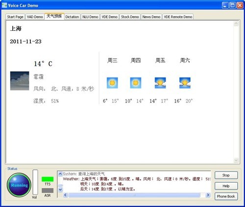比方說(shuō)這個(gè)關(guān)于空調(diào)問(wèn)題,我們過(guò)去,空調(diào)的命令詞是“把空調(diào)打開(kāi),空調(diào)溫度提高3度。”現(xiàn)在我也可以這樣說(shuō),空調(diào)調(diào)高一點(diǎn),我有點(diǎn)冷,也可以。就是你在車(chē)?yán)镞呁耆梢杂媚阕约旱恼Z(yǔ)言來(lái)說(shuō)你想干的事。比如說(shuō),前邊你不知道明天天氣會(huì)怎么樣,人一般都會(huì)想想,明天天氣如何,或者是告訴我天氣預(yù)報(bào)。但是你也可以這樣說(shuō)。明天會(huì)下雨嗎?也可以這樣說(shuō);蛘吣氵@樣說(shuō),你說(shuō),今天大盤(pán)怎么樣。完全是用自然語(yǔ)言來(lái)說(shuō)。堵不堵車(chē),“查詢交通情況!边@就是,實(shí)際上可以有各種不同的說(shuō)法來(lái)完成這個(gè)任務(wù),這是我們自然語(yǔ)言的一個(gè)演示。