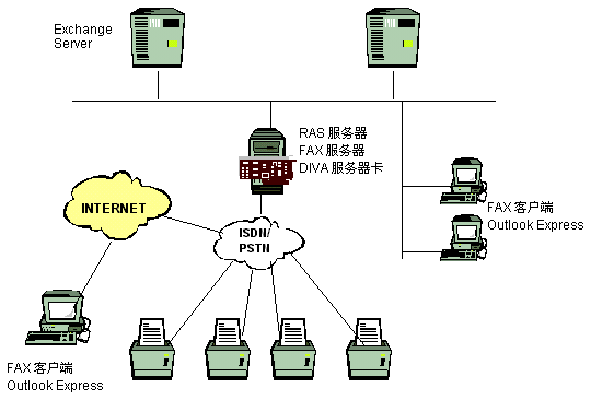 終端設(shè)備:FAX Client(也可以用OUTLOOK 98/EXPRESS)主要是對(duì)FAX Mail進(jìn)行再處理, 比如可以指定到可用的打印機(jī)或傳真機(jī)打印等。
