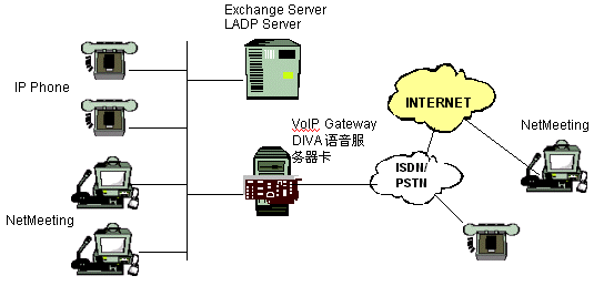電話呼叫。在這種情況下,多于一個(gè)的電話連接可以同時(shí)在IP線路上通過(guò)數(shù)據(jù)包來(lái)傳送。通過(guò)使用G.723.1將語(yǔ)音進(jìn)行壓縮,傳送一路話音所需的帶寬將從64kbps(ISDN線路)減少到5.3kbps.如果在廣域連接中沒(méi)有足夠的帶寬或者廣域連接因?yàn)槟承┮蛟袛,我們(nèi)匀贿可以使用原來(lái)的PSTN來(lái)呼叫遠(yuǎn)端的辦公室。這就意味著用戶可以使用原來(lái)的服務(wù)方式而不僅僅只依賴于IP連接。所以,DIVA語(yǔ)音服務(wù)器的實(shí)施將通過(guò)提供附加的,低費(fèi)用的電話呼