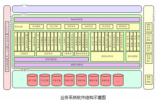 電視購物呼叫中心系統(tǒng)包括客戶管理模塊、會員管理模塊、通話記錄、CALL-BACK單、訂單管理、訂單分檢、物流模塊、財務(wù)模塊、計費(fèi)管理模塊、媒體模塊、投訴模塊、FAQ模塊、產(chǎn)品管理模塊、庫存管理模塊、綜合查詢模塊、排班管理、在線培訓(xùn)、電子公告板、事件跟蹤管理模塊、統(tǒng)計模塊、權(quán)限管理模塊和參數(shù)管理模塊。