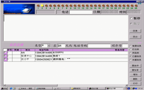 后臺主要完成對短信息的收發(fā),包括群收、群發(fā)的處理,還有生日祝福、定時發(fā)送、短信中心號碼的設(shè)置等(參見使用說明書),即完成與廣播平臺無關(guān)的一些處理。