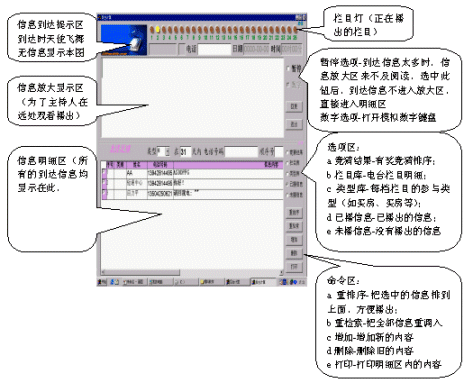 如果信息到達(dá)量過大,會導(dǎo)致信息放大區(qū)中的信息不斷被更新,此時,只要選中暫停選項,信息放大區(qū)的信息就不會被更新。該信息播出后,如果需要播出明細(xì)區(qū)中的內(nèi)容,只要在明細(xì)區(qū)中用鼠標(biāo)左鍵雙擊該信息的信息內(nèi)容,該信息內(nèi)容立即上升到放大區(qū)中,同時該信息發(fā)送人的姓名、性別、電話、日期、時間會同時上升到放大區(qū)上方,而且該信息內(nèi)容會自動轉(zhuǎn)移到已播出信息中(這樣可以迅速明細(xì)區(qū)中的信息減少,方便主持人播出其他信息)。